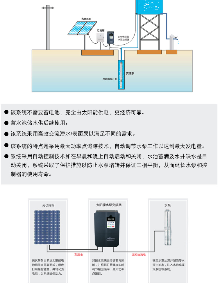 易用性好:只需將太陽能板接入變頻器,通電后即可實(shí)現(xiàn)交流水泵自動啟動