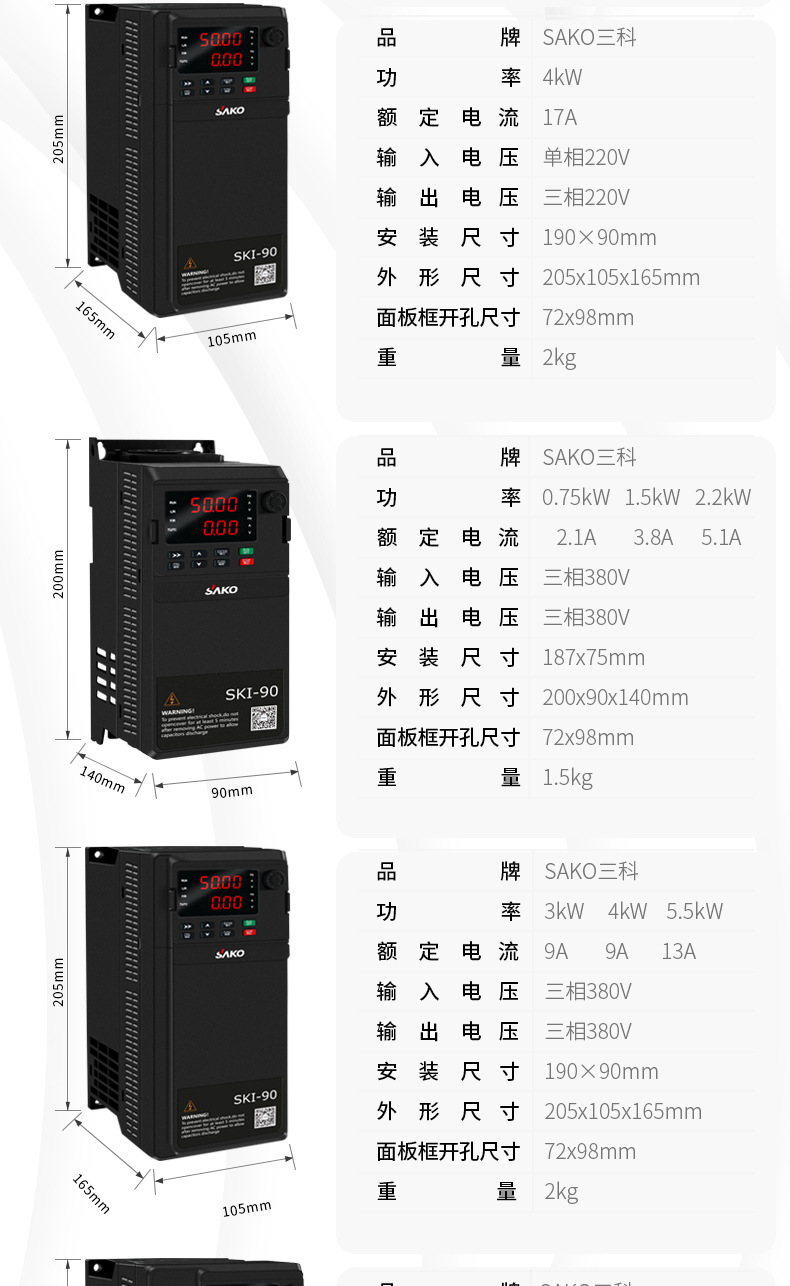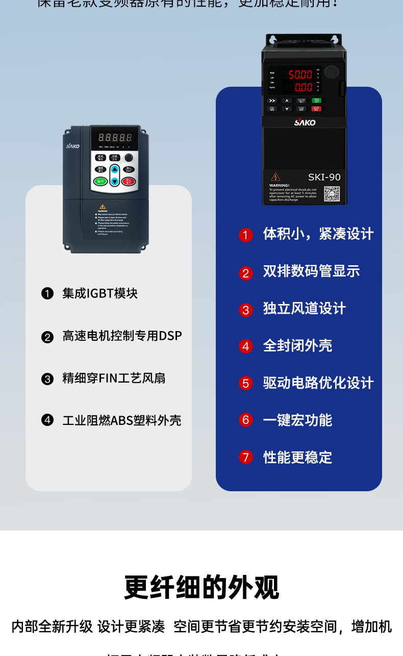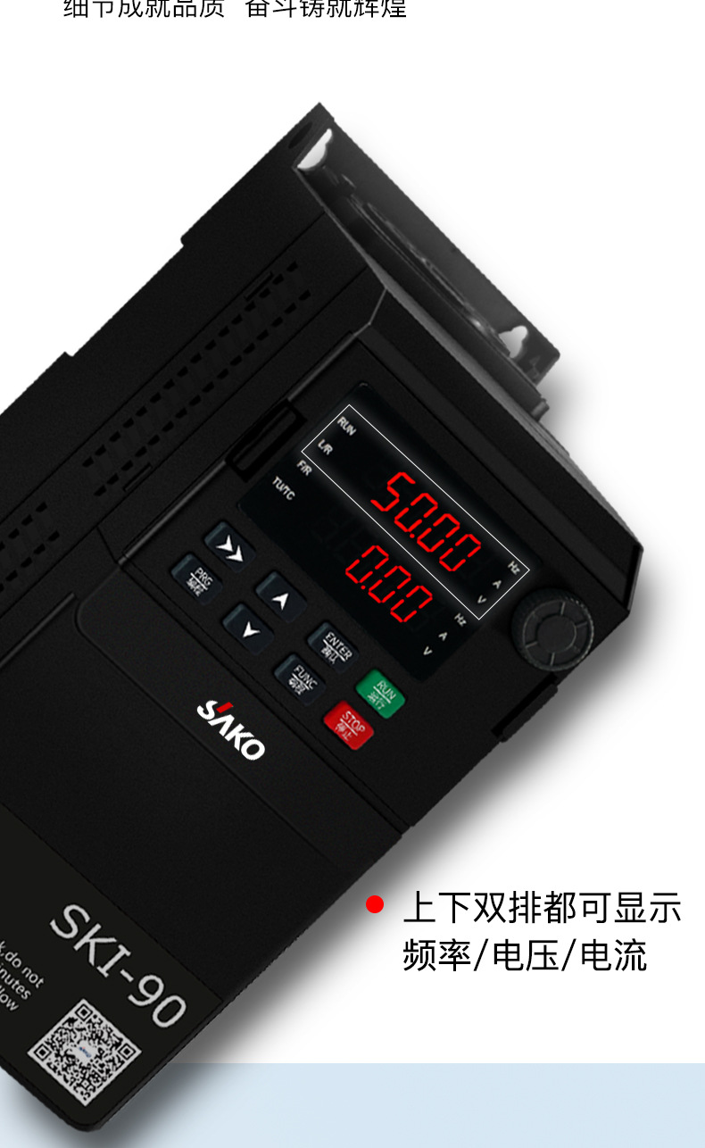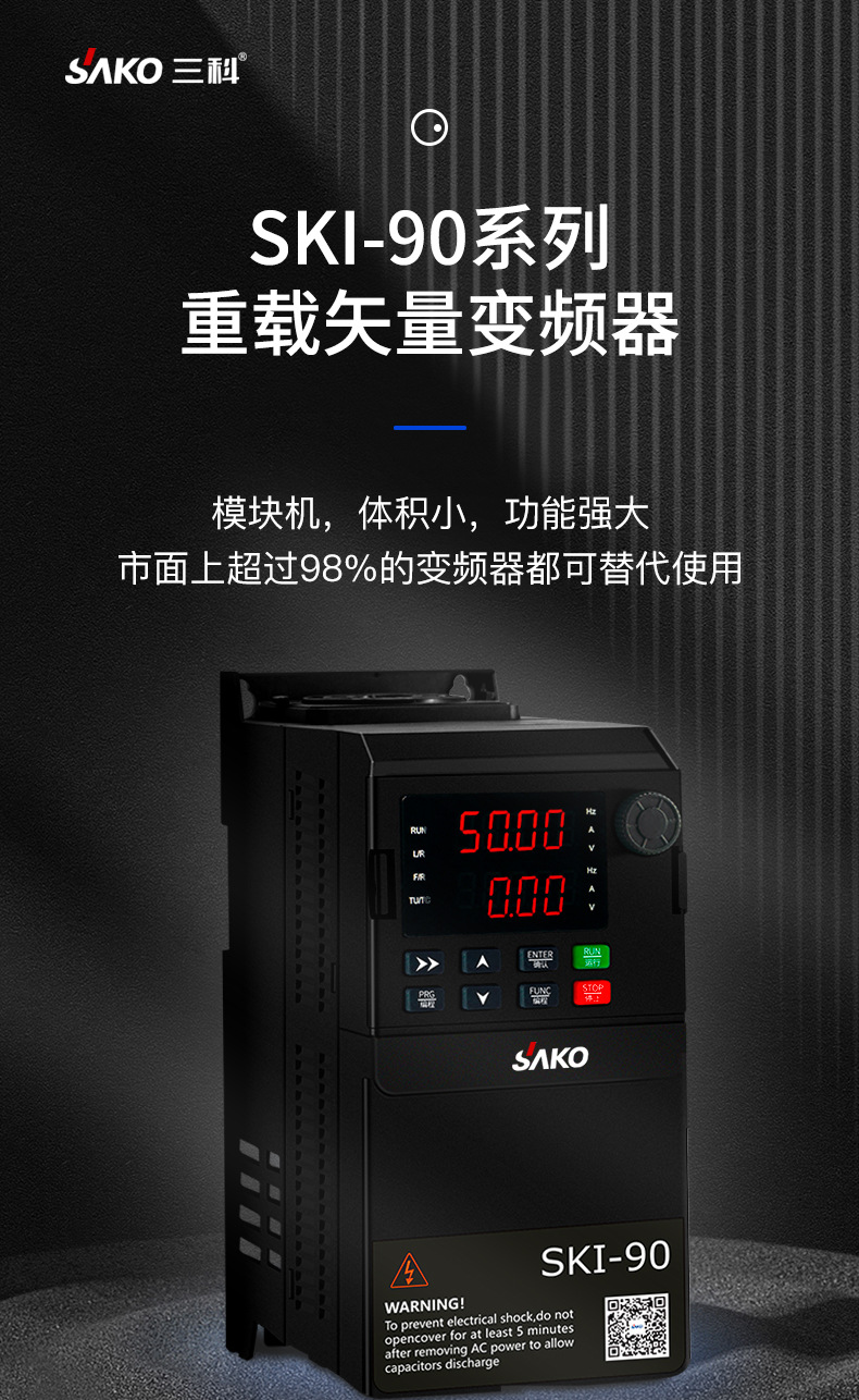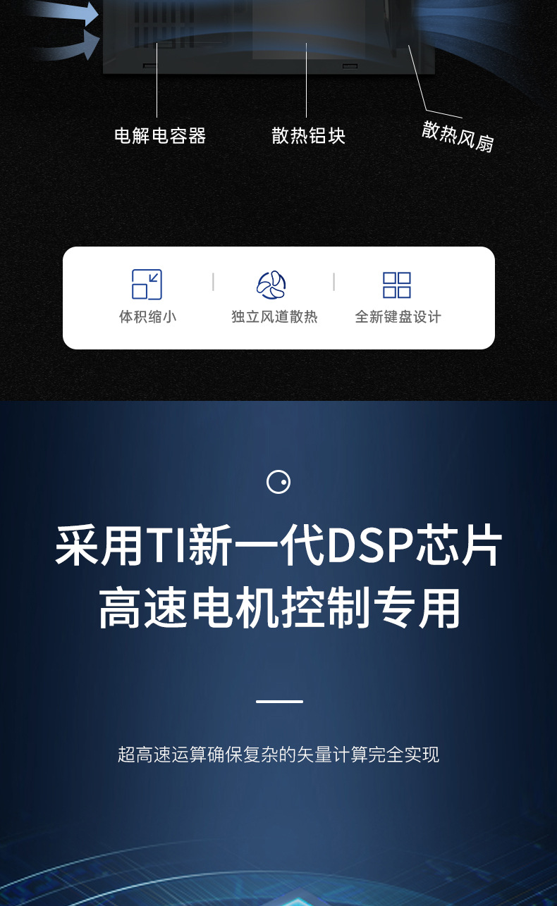 模塊機(jī),體積小,功能強(qiáng)大,市面上超過98%的變頻器都可替換使用,纖細(xì)外觀,內(nèi)部全新升級(jí),設(shè)計(jì)更緊湊,空間更節(jié)省更節(jié)約安裝空間,增加機(jī)柜里變頻器安裝數(shù)量,有效降低成本,雙排LED超清顯示,面板可外接延長。上下雙排都可顯示頻率,電壓,電流。