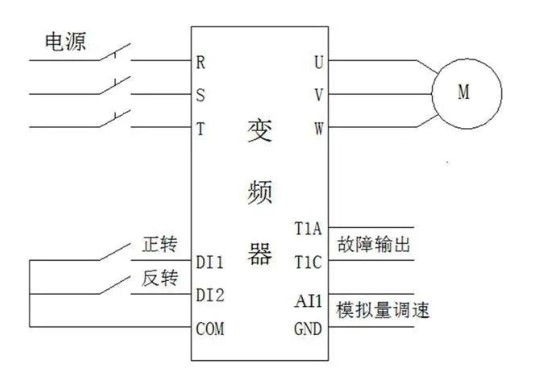 例如一個開關(guān)收到變頻器的正轉(zhuǎn)接線端子(一些是FWD,這兒是DI1),此刻變頻器會正轉(zhuǎn),開關(guān)自然要挑選維持式的,當開關(guān)斷掉后,變頻器會立即終止。