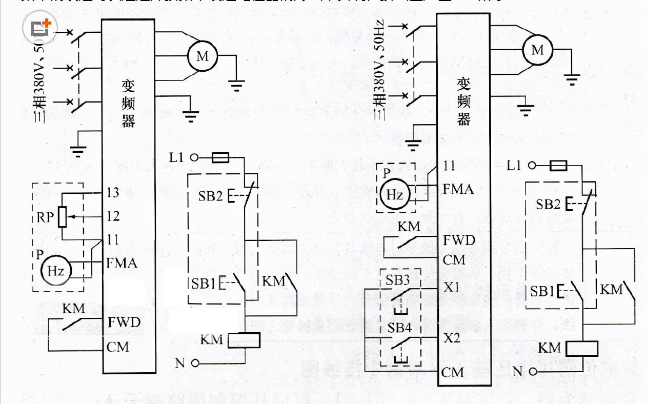 在圖2-18(a)中,運行與終止根據(jù)FWD和CM接線端子來完成。右側的虛線框中的SB1為啟動按鍵,SB2為終止按鍵。RP為手動式頻率設置電位器,P為頻率表,均安裝在現(xiàn)場實際操作面層上。