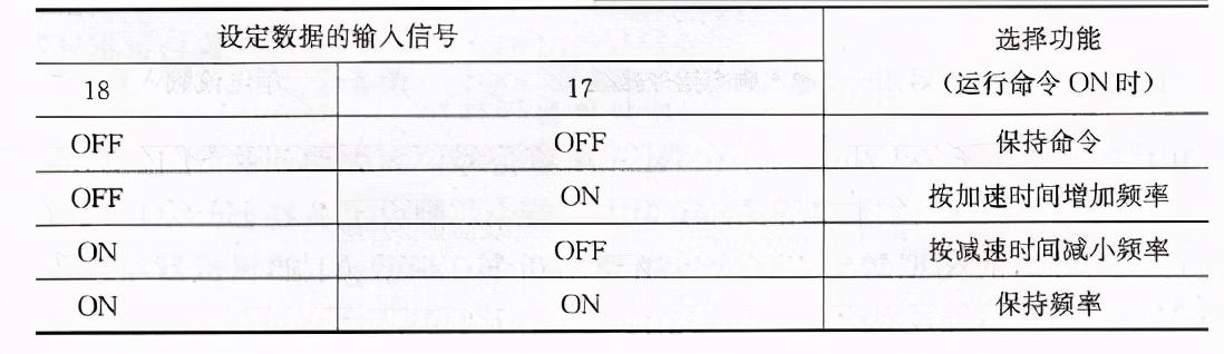 RP的應用有其局限。它是因為RP鍵入的是0~10V的電壓數(shù)據(jù)信號,而電壓數(shù)據(jù)信號伴隨著傳送間距的增加遭受的影響擴大。假如安裝現(xiàn)場與變頻器間距較遠,則沒法確保數(shù)據(jù)信號傳送的精確性。在這類狀況下,頻率數(shù)據(jù)信號能夠那樣來設置:在鍵入接線端子X1~X9中,隨意特定某2個接線端子,并設置其數(shù)據(jù)信息為“17”(增指令)和“18”(減指令),那樣在運作數(shù)據(jù)信號(ON)時,可用外界觸點鍵入數(shù)據(jù)信號增/減設置頻率。接線端子的作用見表2-4,這時的接線方法如圖2-18(b)所顯示。
