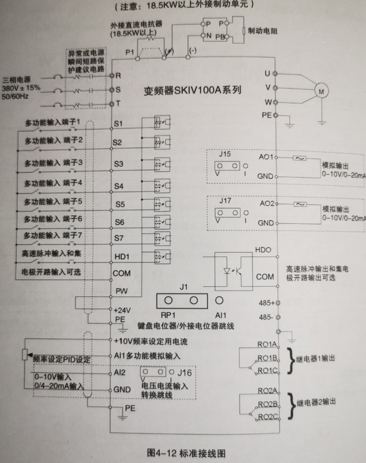 4、拆卸完前蓋板后,進行主電路接線,其中R、S、T是電源進線,U、V、W是出線,接電動機,注憊為保證電氣安全,必須進行可靠接地。