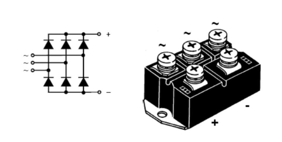 我們通常把將交流變換為直流的過(guò)程稱之為整流。變頻器所采用的整流方式通常是三相全橋不可控整流,整流器件為將6顆整流二極管模塊化封裝的整流橋堆,俗稱整流橋。整流橋的參數(shù)主要就是額定電流值和耐壓值。