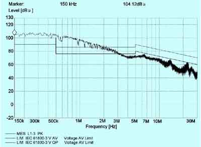 圖1 普通變頻器在采取簡單的EMC措施后電源端的傳導(dǎo)干擾頻譜圖