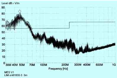 圖2 普通變頻器在采取簡單的EMC措施后, 天線在5m處接收到的輻射干擾頻譜圖