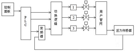 PLC在系統(tǒng)中的作用是控制交流接觸器組在工頻和變頻之間切換,調(diào)節(jié)水泵的工作量。