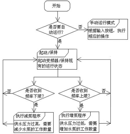 手動(dòng)模式主要用于解決系統(tǒng)錯(cuò)誤或設(shè)備問題。另外,為了防止PLC故障造成系統(tǒng)停機(jī),手動(dòng)控制沒有進(jìn)入PLC程序,這樣更有利于系統(tǒng)的升溫。在自動(dòng)運(yùn)行模式下,如果PLC接收到頻率上限信號,將執(zhí)行增泵程序,增加水泵的工作量。如果PLC接收到頻率下限信號,將執(zhí)行減泵程序,減少水泵的工作量。如果您沒有收到信號,您將保持當(dāng)前的操作狀態(tài)。
