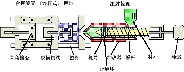 普通注塑機(jī)通常采用液壓傳動(dòng)。 其結(jié)構(gòu)如下所示,主要包括注射裝置、開合模裝置、液壓傳動(dòng)裝置和電氣控制裝置。
