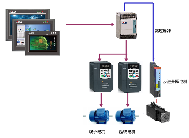 整套系統(tǒng)是由一臺(tái)SK-C的PLC和S系列的7寸觸摸屏以及2臺(tái)SKI600構(gòu)成,另外,每5臺(tái)整機(jī)另加一臺(tái)SKI600,一拖多控制頂輪的旋轉(zhuǎn),每臺(tái)機(jī)分前后兩面,共兩套。