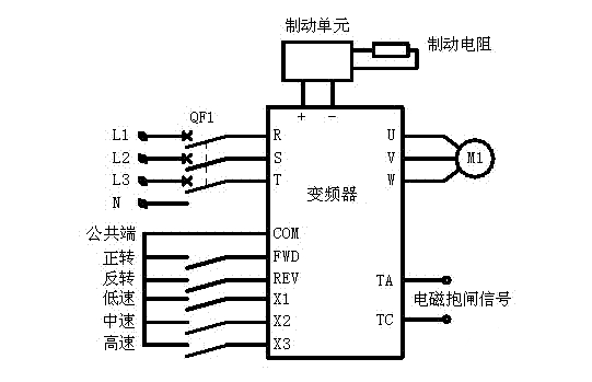 提升機(jī)傳統(tǒng)的操作方式為,操作工人坐在煤礦井口操作臺(tái)前,手握操縱桿控制電機(jī)正﹑反轉(zhuǎn)個(gè)三擋速度。為適應(yīng)操作工人這種操作方式,采用多段速度設(shè)置,F(xiàn)WD、REV設(shè)為正反轉(zhuǎn),X1、X2、X3設(shè)為低、中、高三擋速度。變頻調(diào)速原理圖如下圖所示。