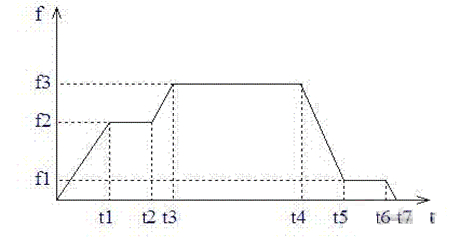 (2)第二階段 t1~t2:重車起動(dòng)后,通過加速至頻率為f2速度運(yùn)行,中速運(yùn)行的時(shí)間較短,只是一過渡段,加速時(shí)間內(nèi)設(shè)備如果沒有問題,立即再加速到正常運(yùn)行速度。