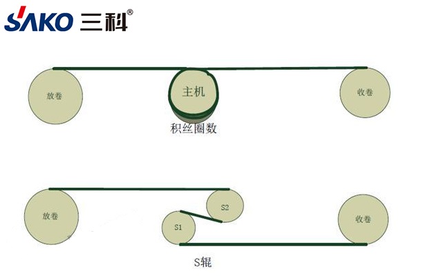 此方案收卷和放卷采用三科SKI600變頻器,自動(dòng)進(jìn)行恒張力控制。牽引S輥S1和S2采用三科變頻器SKI600變頻器協(xié)同作用實(shí)現(xiàn)電子同步功能,共同出力完成對(duì)材料的速度的同步控制。系統(tǒng)共直流母線,放卷一直正常工作一直處于發(fā)電狀態(tài),回饋電能給動(dòng)力源S輥和收卷使用,節(jié)約電能。整個(gè)系統(tǒng)減速能量釋放需要使用制動(dòng)電阻完成,對(duì)于大功率變頻器能耗制動(dòng)可以使用相應(yīng)制動(dòng)單元。