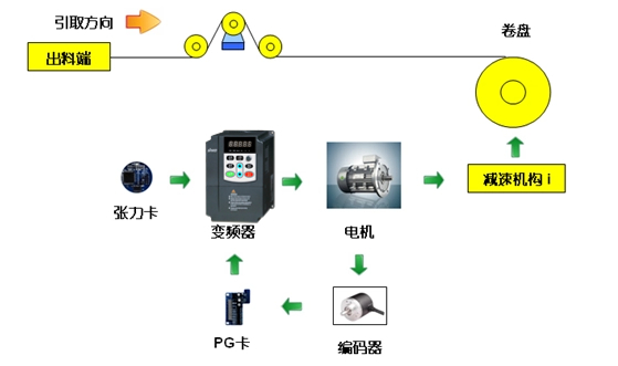 如下圖所示,收卷的恒張力控制,是按照工藝將系統(tǒng)收卷所需的張力及空、滿盤卷徑設(shè)置到張力卡,張力卡根據(jù)運(yùn)行線速度,計(jì)算出當(dāng)前卷徑,進(jìn)而得到收卷所需的轉(zhuǎn)矩并將其給到后再進(jìn)行轉(zhuǎn)矩控制。在收卷過程中,系統(tǒng)可自動(dòng)實(shí)時(shí)計(jì)算當(dāng)前的卷徑,以保證收卷張力的恒定。同時(shí)系統(tǒng)張力錐度的設(shè)置可使材料較好的卷曲成型。