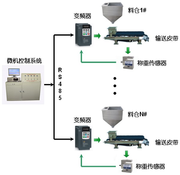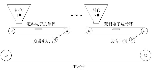 其主要工作流程是:料倉打開后,物料落入相應(yīng)的皮帶上,皮帶電機(jī)拖動(dòng)皮帶轉(zhuǎn)動(dòng),則物料被連續(xù)拉出,皮帶電機(jī)的轉(zhuǎn)速就決定了物料的流量。每個(gè)皮帶下面有一自動(dòng)稱重皮帶秤,通過皮帶秤就可以稱出下料的流量、累積量等數(shù)據(jù)。所有皮帶的下面是一輸送主皮帶,主要作用是把混合好的原料送到下級(jí)容器中。