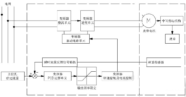 過流量設(shè)定及反饋,調(diào)節(jié)SKI600的輸出頻率以控制輸送皮帶的轉(zhuǎn)速,自動(dòng)實(shí)現(xiàn)給料流程的精確控制和給料總量的準(zhǔn)確計(jì)量。SKI600流量PID閉環(huán)調(diào)節(jié)結(jié)構(gòu)圖如圖3 所示。