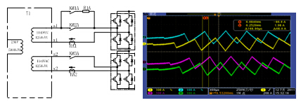 鐵路上供電電源為單相25kV,試驗臺的電源是鐵路電網中取電,采用25kV的電源供電。兩臺變流器中共4個模塊的輸入電流錯相控制,通道1(黃色)和通道2(藍色)為一臺變流器的兩個模塊輸入電流,通道3(紫色)和通道4(綠色),為另一臺變流器輸入電流。
